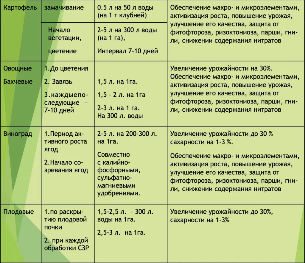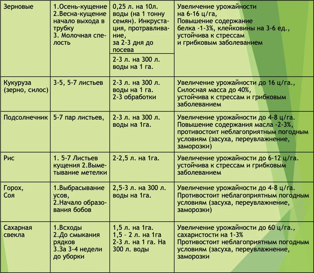 «Зерновые» (озимые, яровые, рапс); «Картофельный» (для пред посадочные обработки клубней, долей и вегетирующих растений);