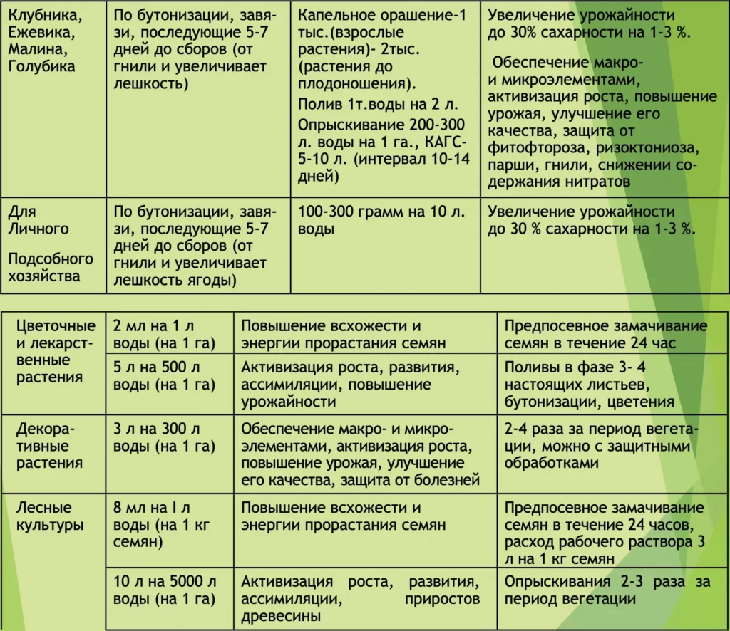 Препарат применяется: для предпосевной и предпосадочной обработки семян, клубней, рассады, саженцев; для полива и опрыскивания вегетирующих растений. В качестве биологически активной добавки к органическим удобрениям в период их нако- пления и внесения в почву, с микроэлементами в хелатной форме.